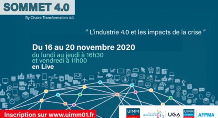 La crise sanitaire aura bousculé les modes d’interaction et encouragé de nouvelles plateformes d’échanges. L’UIMM de l’Ain et Grenoble INP – Génie industriel, UGA dans le cadre de leur chaire commune « Transformation 4.0 » proposent une réflexion sur les impacts de la crise sanitaire actuelle à l’occasion du « Sommet 4.0 - L'industrie 4.0 et les impacts de la crise » du 16 au 20 novembre 2020. Evènement en ligne / inscription obligatoire.