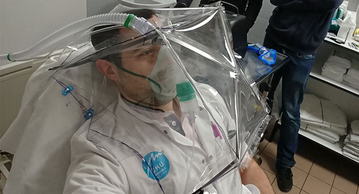 Chercheur au laboratoire G-SCOP* et enseignant à l’IUT GMP**, Nicolas Béraud a participé au développement d’une bulle de confinement de la sphère ORL pour le transport par hélicoptère de patients atteints de Covid-19.
